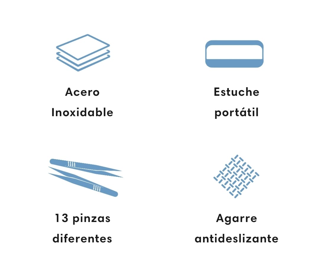 El kit incluye8 herramientasdiferentes, con 13 puntas diferentes cada una diseñada para tratar distintos tipos de espinillas y puntos negros. También viene con un estuche compacto para transportarlas.
